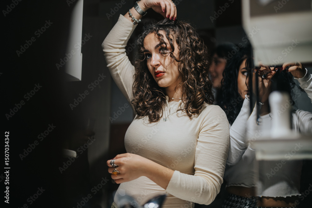 Two women are styling their hair in a cozy setting. Focusing on grooming and confidence, the image depicts friendship and preparation for an event, emphasizing bonding and personal care.