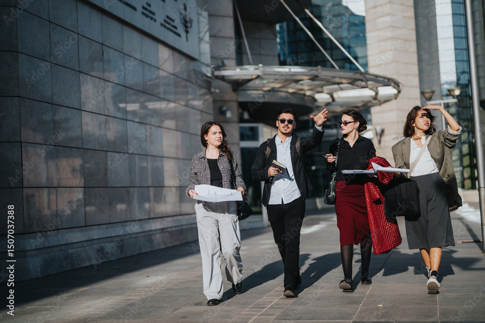 A diverse group of business people discussing and analyzing strategies while walking outside an urban office building. They carry paperwork and exhibit teamwork, innovation, and communication.