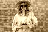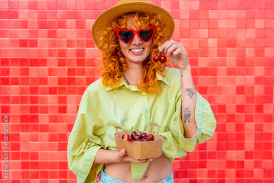 Young woman eating cherries from a small cardboard box, wearing heart shaped sunglasses and straw hat