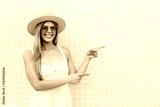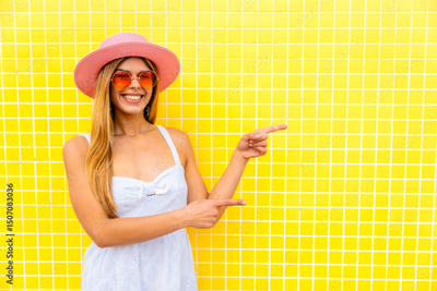 Smiling young woman pointing to empty space on yellow tiled wall