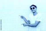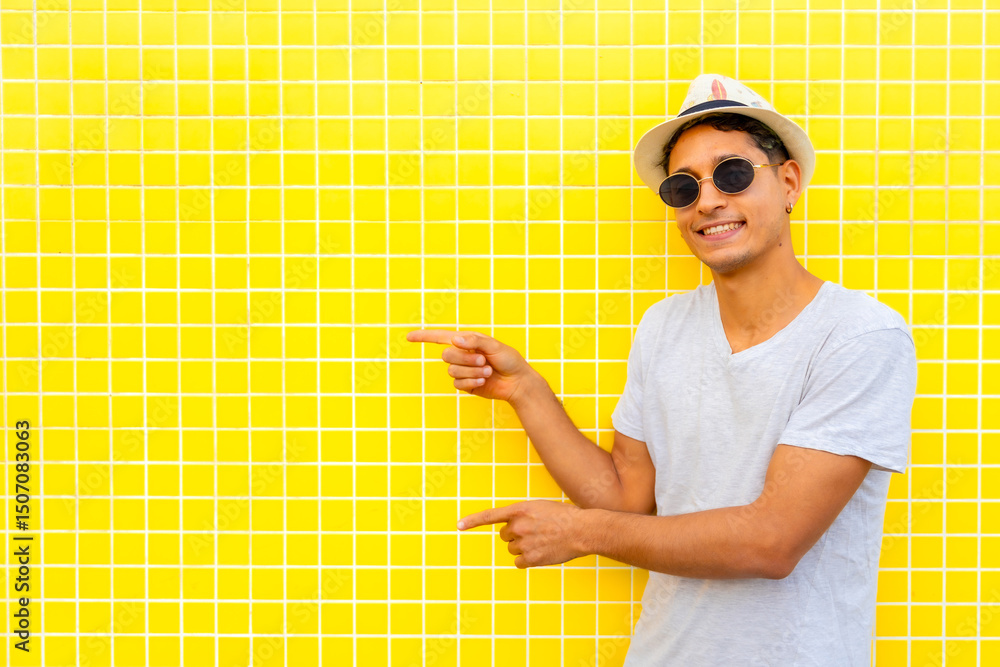 Young tourist pointing at yellow wall, wearing sunglasses and hat