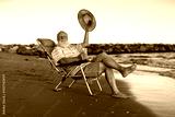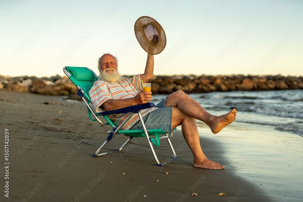 Cheerful elderly man relaxing on the beach, sitting in a chair with a glass of orange juice, smiling and waving his straw hat, enjoying retirement, freedom and happiness during golden sunset.