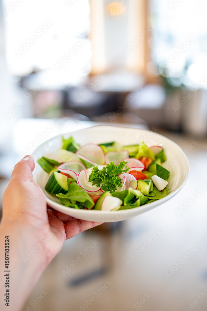 A hand holds a white bowl filled with a fresh salad of sliced radishes, cucumbers, lettuce, and parsley. The vibrant colors and crisp textures highlight healthy eating in an inviting setting