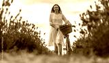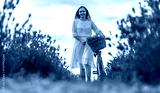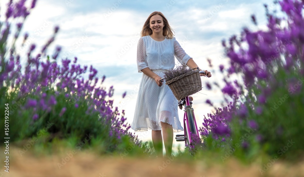 Woman in white dress in lavender field with bicycle.
