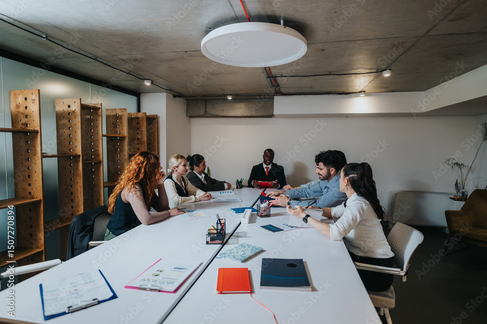 Group of people holding a team meeting in a contemporary office environment, engaging in collaborative discussion