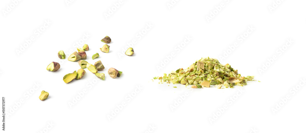 Fried salt pistachio nuts isolated. Baked pistachios pile, roasted green pistache fruits on white