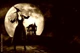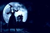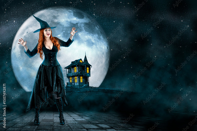 Witch on Halloween. Female wizard fairy character for All Saints' Day. Fantasy gothic red-haired Vampire girl in black dress. Enchantress dressed in carnival costume