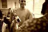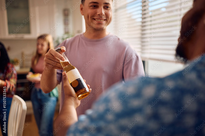 Close up of men drinking beer during home party.