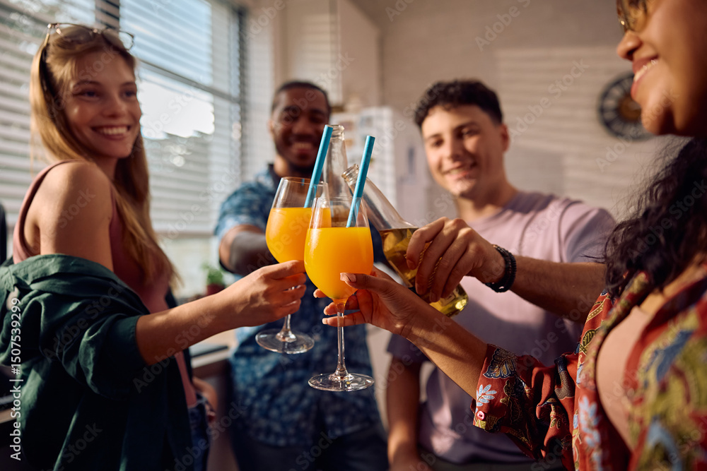 Close up of multiracial group of friends toasting during home party.