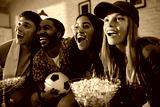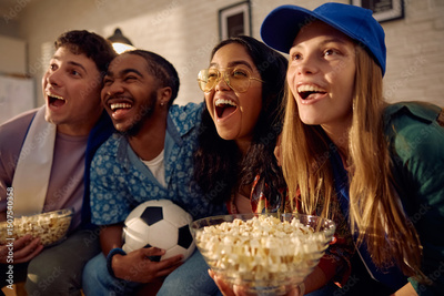 Multiracial group of cheerful soccer fans watching game on TV at home.
