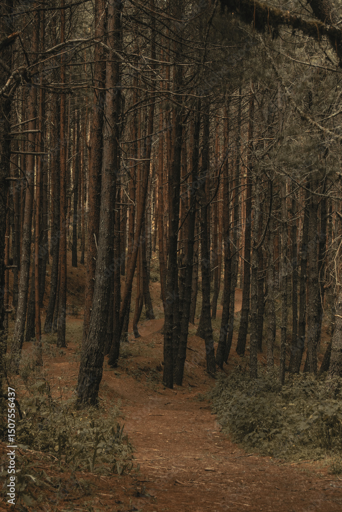 Quiet path between trees in the middle of the forest