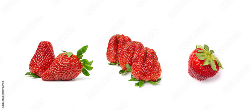 Fresh strawberry pile isolated, whole ripe straw berries, red juicy imperfect strawberri