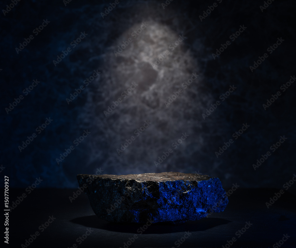 real black stones on dark background with aquamarine blue lighting for podium