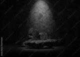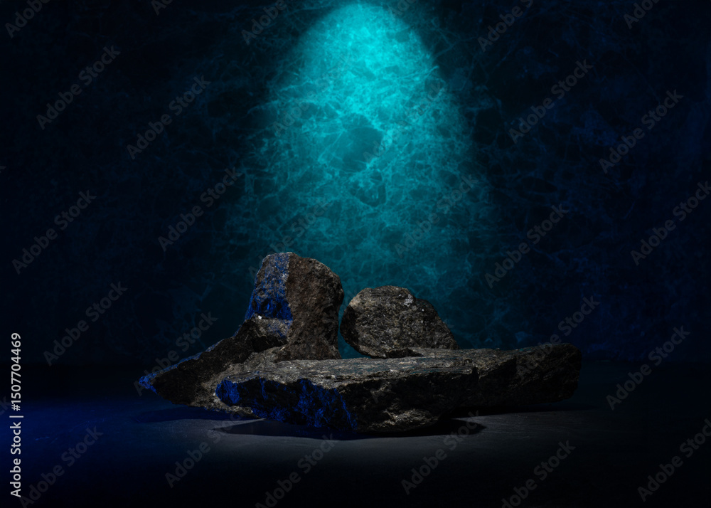 real black stones on dark background with aquamarine blue lighting for podium