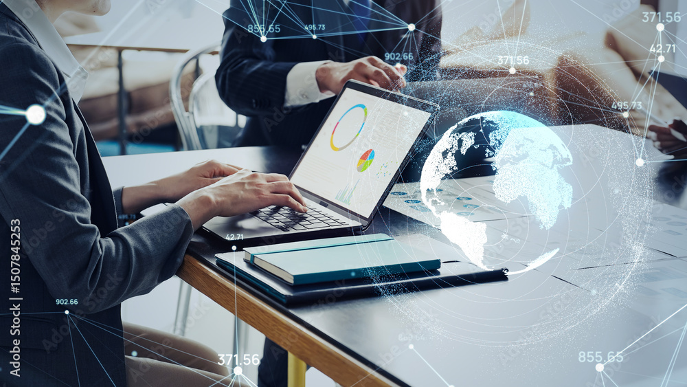 会議するビジネスパーソンのグループとグローバルネットワークのコンセプト バナー・広告向けビジュアル