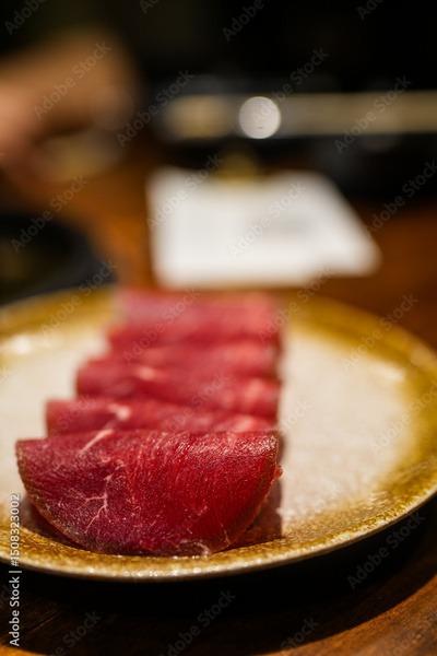 Fresh raw beef slices for grilling, yakiniku, sukiyaki or shabu.