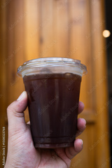 Close up of take away plastic cup of iced black coffee or Americano on wooden background.