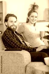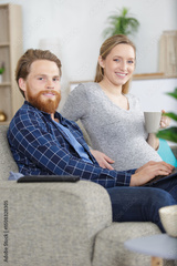 cheerful couple using laptop at home