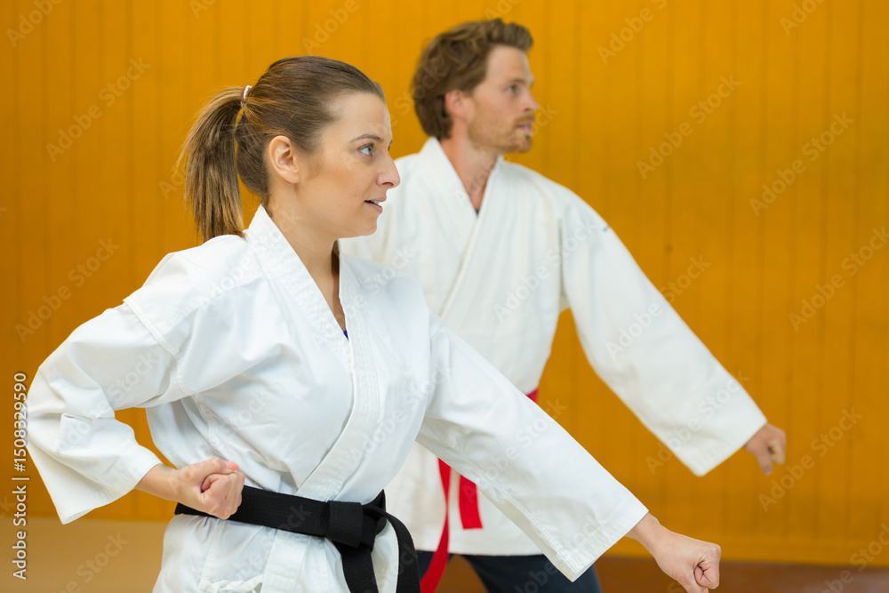 young woman and man in kimonos making a combat stance