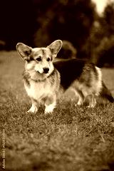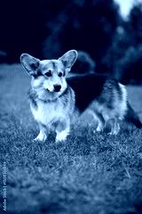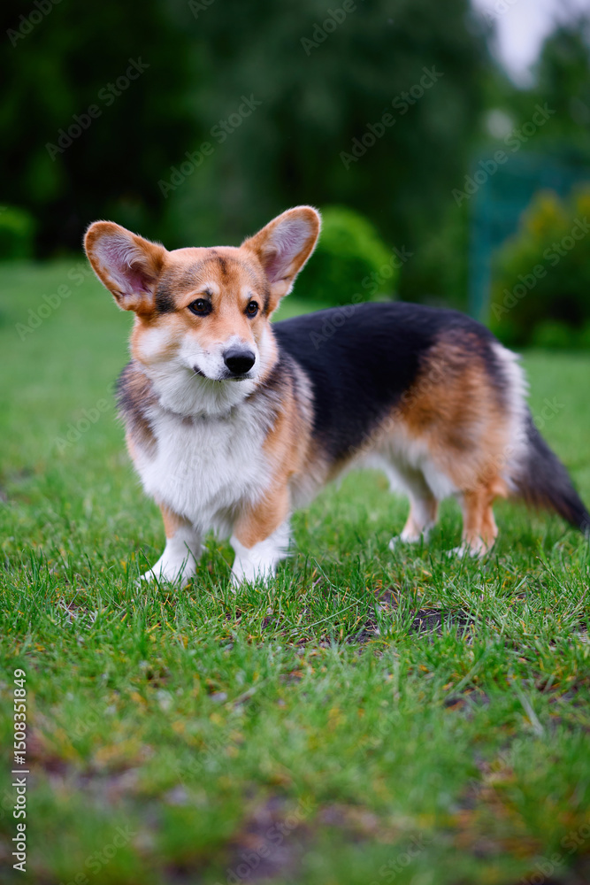 Happy and active purebred Welsh Corgi dog outdoors in the grass on a sunny summer day.