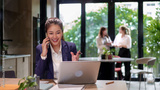 Asian Businesswoman Working on Laptop and Talking on Phone in Office Business Asian Adult Woman Calling Corporate Conversation
