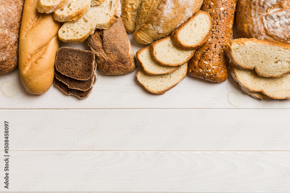 Homemade natural breads. Different kinds of fresh bread as background, top view with copy space