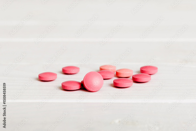 Collection Of Various Medical Tablets And Pills. Assorted pharmaceutical medicine pills, tablets and capsules on table background. Heap of assorted various medicine tablets. Health care
