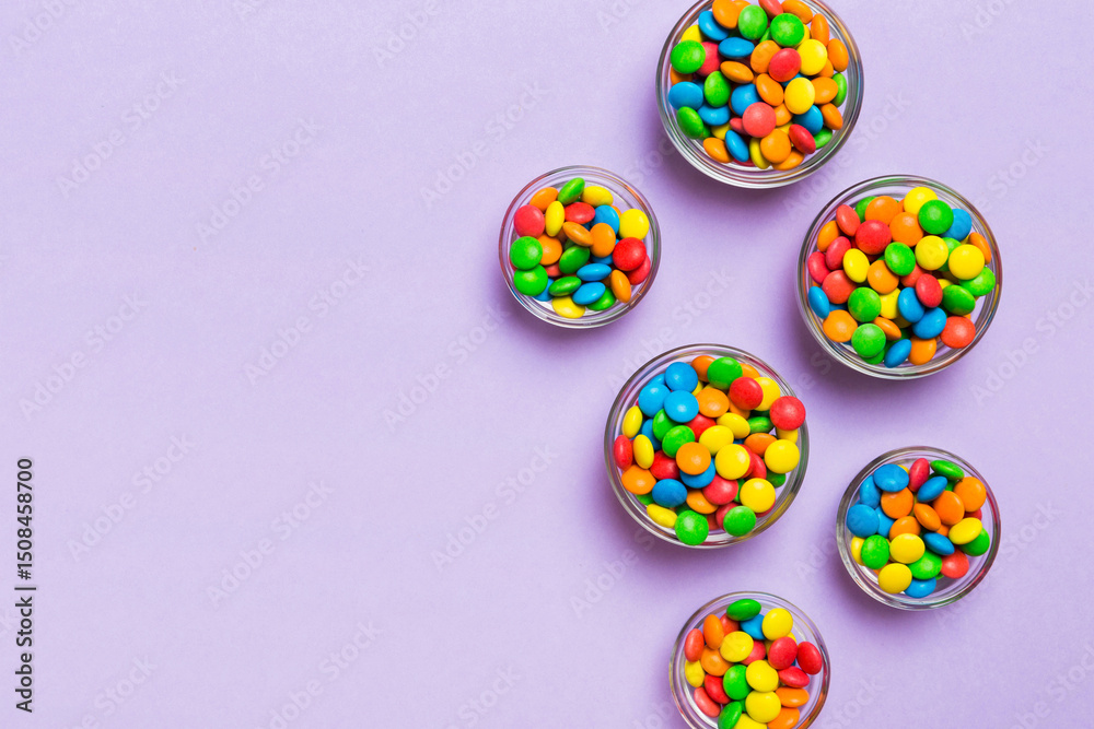 different colored round candy in bowl and jars. Top view of large variety sweets and candies with copy space