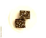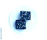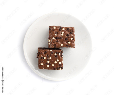 Chocolate brownie cake sprinkled with white and dark balls, classic birthday brownie square piece