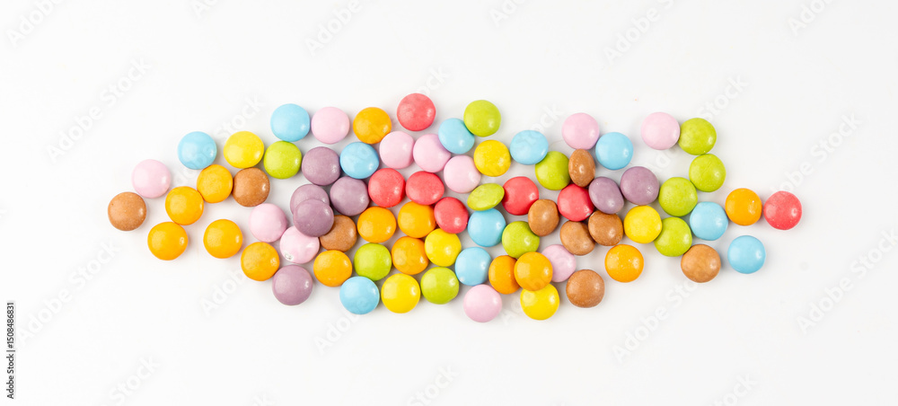 Scattered small candies isolated. Colorful dragees, multicolored glazed chocolate buttons