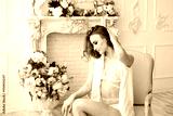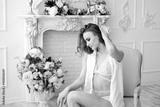 attractive girl in lace lingerie sits surrounded by beautiful flowers