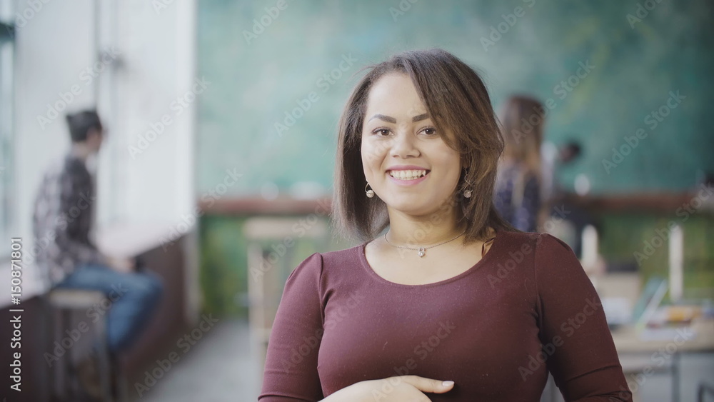Portrait of young successful female employee. African woman entrepreneur worker in busy office, looks at camera, smile.