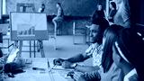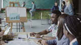Female blonde manager comes to young business team. Multiracial group of people meeting in trendy hipster office.