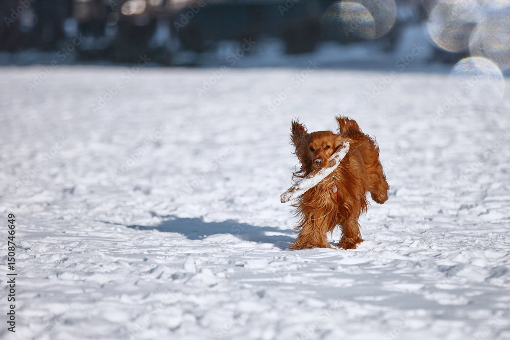 Red spaniel dog plays with a stick outside in winter