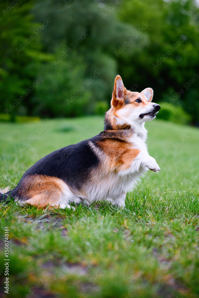 Happy and active purebred Welsh Corgi dog outdoors in the grass on a sunny summer day.