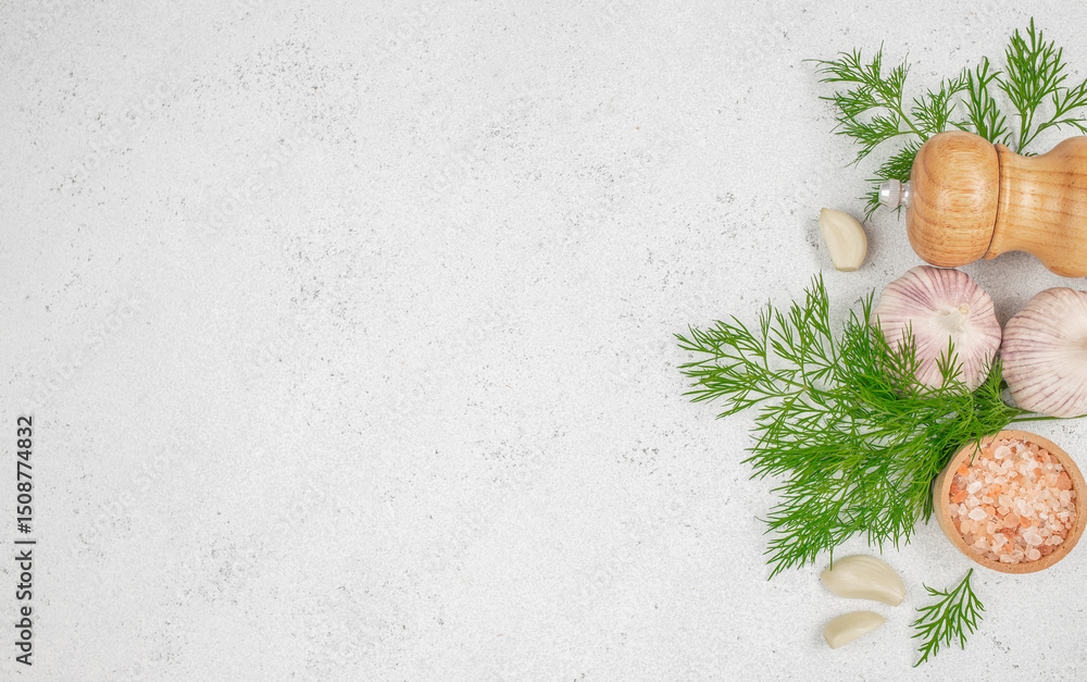 Fresh herbs and spices on white background with copy space. cooking background, top view