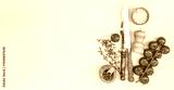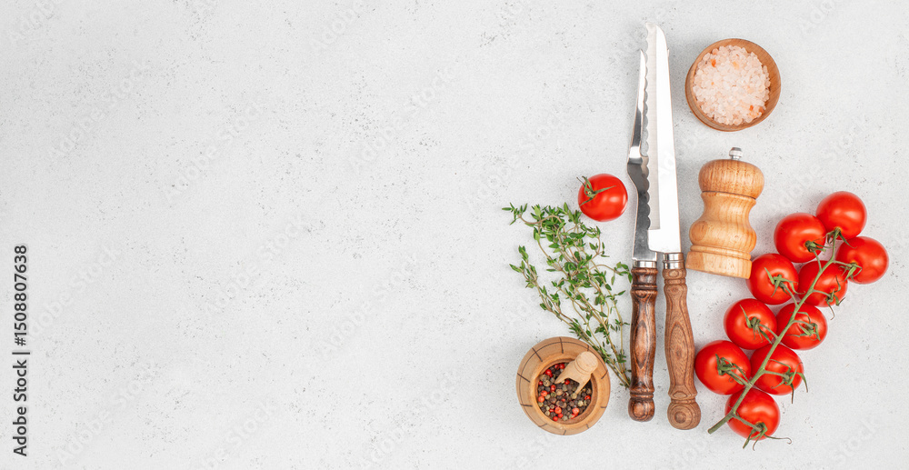 Set of fresh tomatoes, herbs, salt, pepper and kitchen knives arranged on light background for cooking. Long banner format. top view. copy space