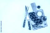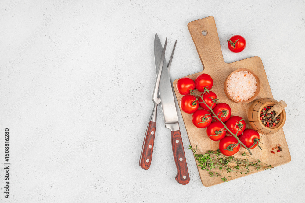 Top view of fresh tomatoes, herbs, salt, pepper and kitchen tools on wooden cutting board. copy space