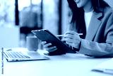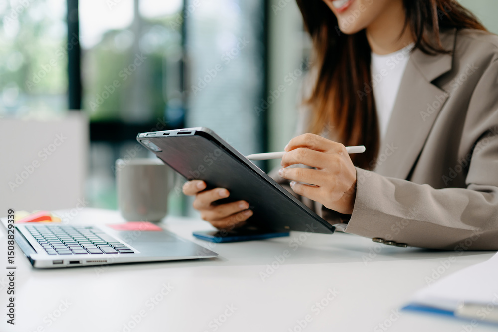 Businesswoman hand working digital marketing media in virtual screen with mobile phone and modern compute at office
