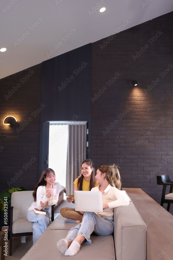 Asian Women Relaxing with Laptop, Credit Card, and Coffee Indoor Modern Living Space Socializing Study Online Shopping or Browsing Asian Friends Together