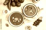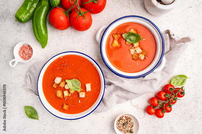 Gazpacho soup in bowl with ingredients over white stone background. Cold tomato soup. Healthy food concept. Top view, flat lay. High quality photo