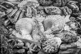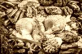 Seafood cuisine plate as an ocean gourmet dinner background. Crab, seashells, oysters, shrimp and other seafood delicacies.