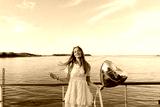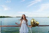 A joyful woman is celebrating by the peaceful water, holding vibrant flowers and enjoying the beautiful view around her