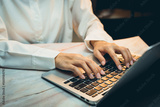 Business concept of working, Young Professional Typing on Laptop Keyboard in Modern Workspace with Focused Expression and Stylish Attire