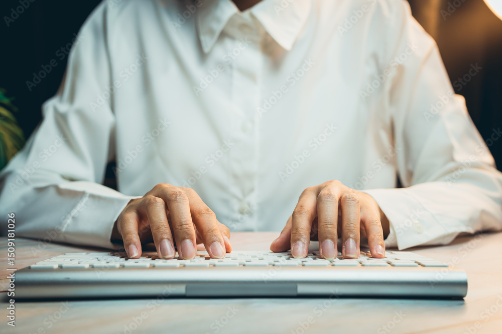 Business concept of working. Professional Focus on Typing at Desk with Hands on Keyboard in Modern Office Setting