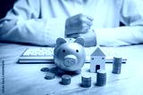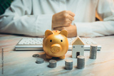 Home buying concept. Golden Piggy Bank, House Model, and Coins on Table with Person's Hand Gesture Representing Financial Planning