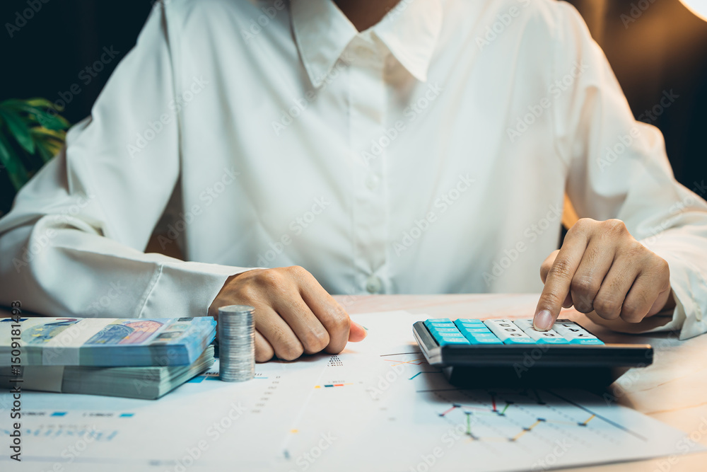 Business concept. Business Professional Using Calculator for Financial Analysis with Cash and Financial Charts on the Table
