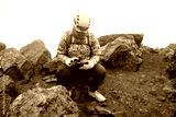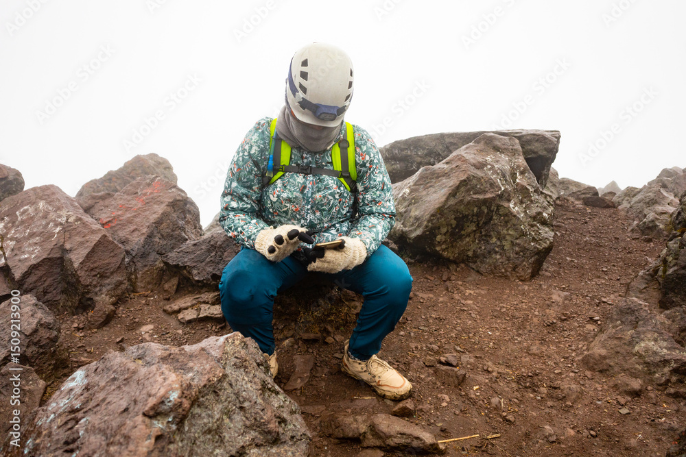 Hiker Sitting on Rocky Trail in Foggy Weather, Checking Device