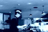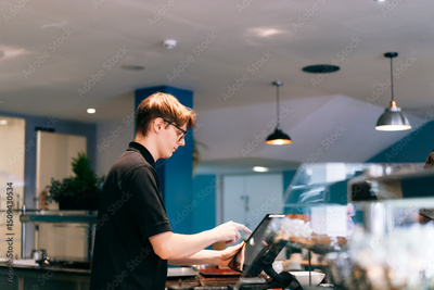 Young waiter serving customer at cash point in cafe. Man working with POS terminal. Student working part-time. Problems of unemployment and Job opportunities for youth. Small business vacancies