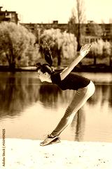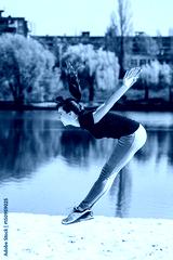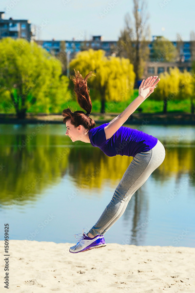 Young brunette in a blue sports shirt doing a jump on the beach. Woman doing fitness exercise outdoors.